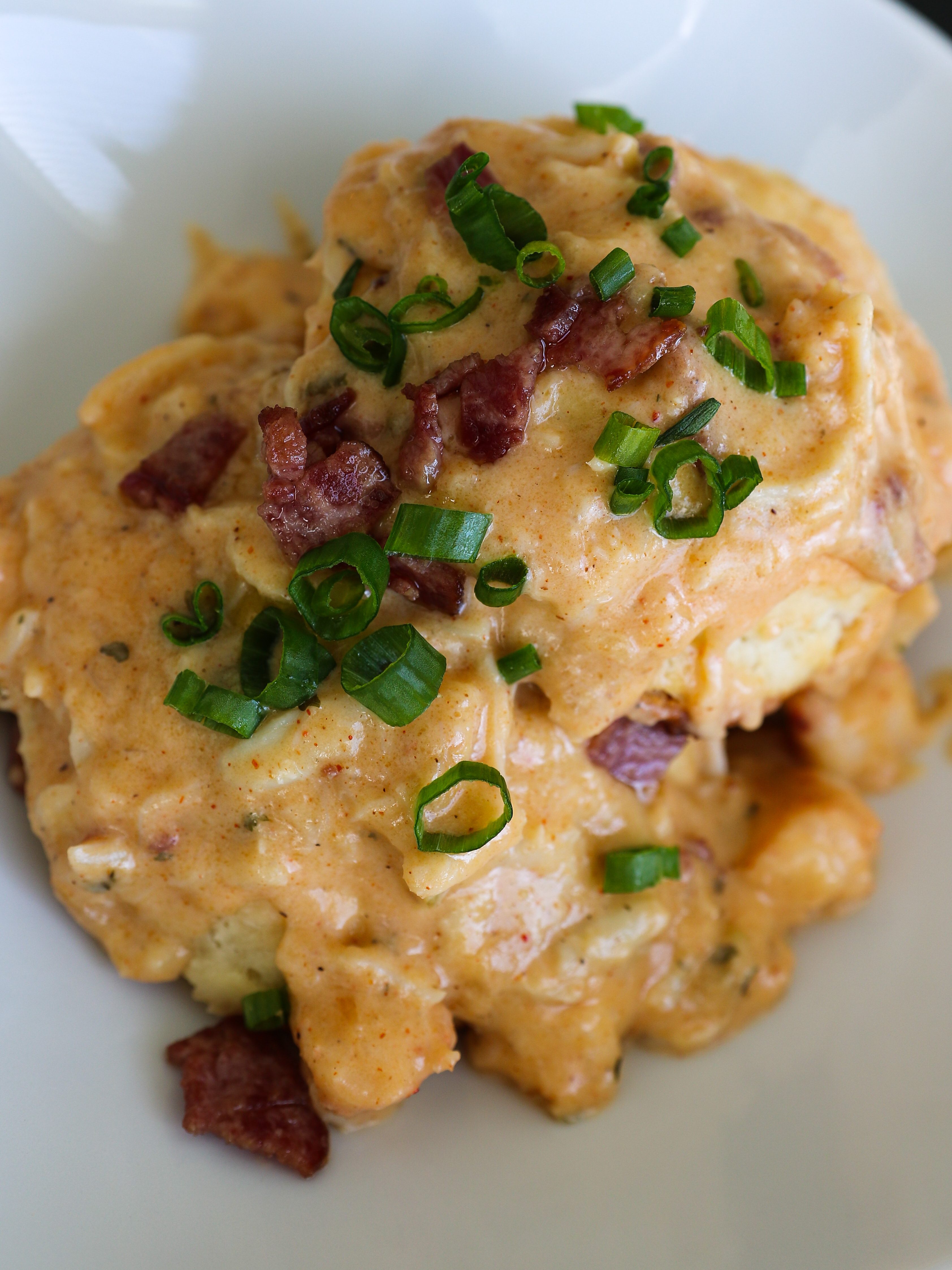 Melt-in-your-mouth buttermilk biscuits, smothered in creamy seafood gravy, topped with crispy bacon and fresh green onions. The flavors. The textures. Just chef’s kiss. You’ve got to make these Biscuits and Seafood Gravy for your next brunch at home.