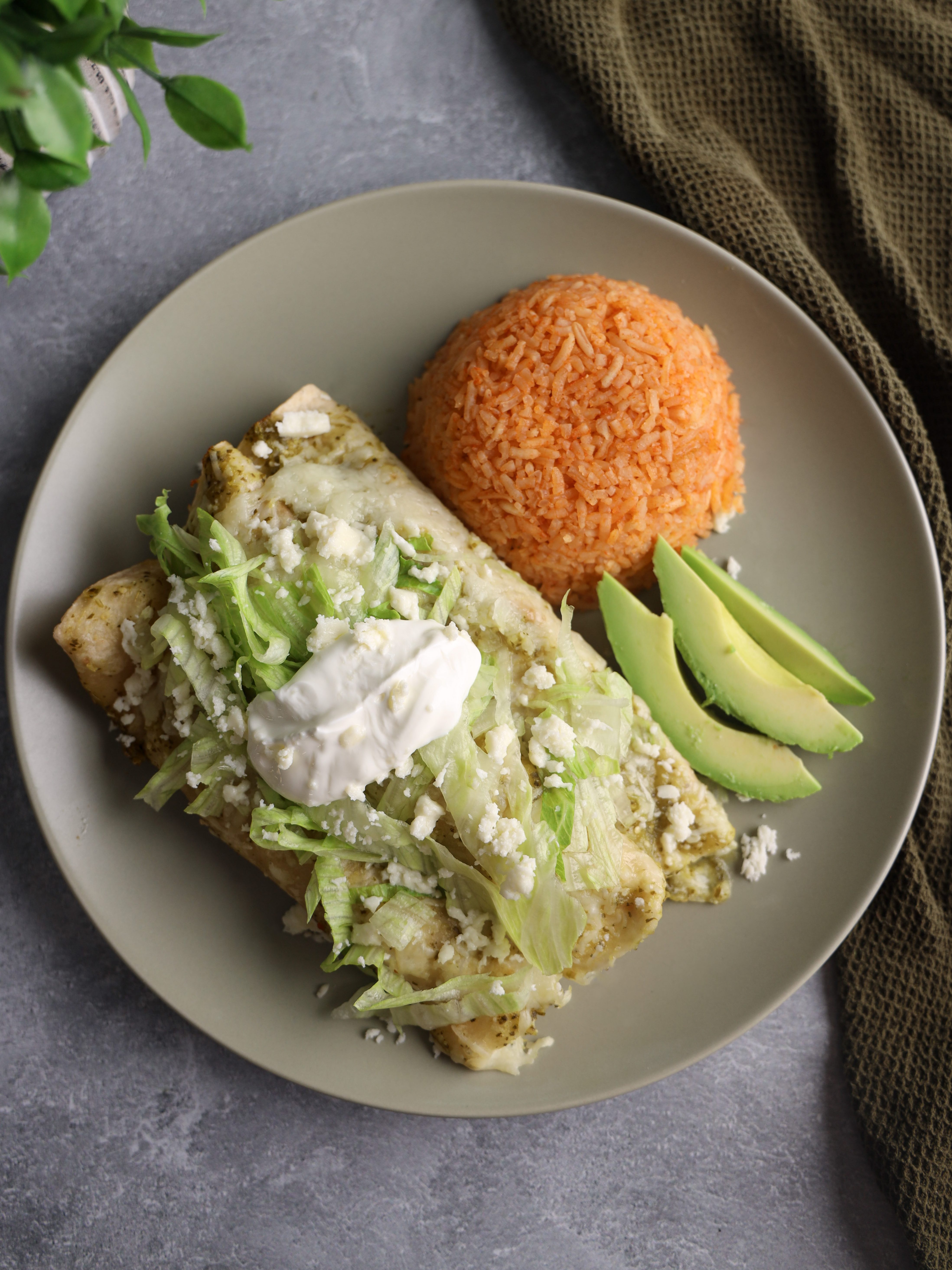 Enchiladas verdes. Soft and warm tortillas stuffed with shredded chicken, melty cheese and salsa verde rolled to perfection, nestled together and smothered in spicy salsa verde and topped with more cheese. These enchiladas are served with crema, lettuce and queso fresco. They’re flavorful and super easy to make. The perfect weeknight meal.